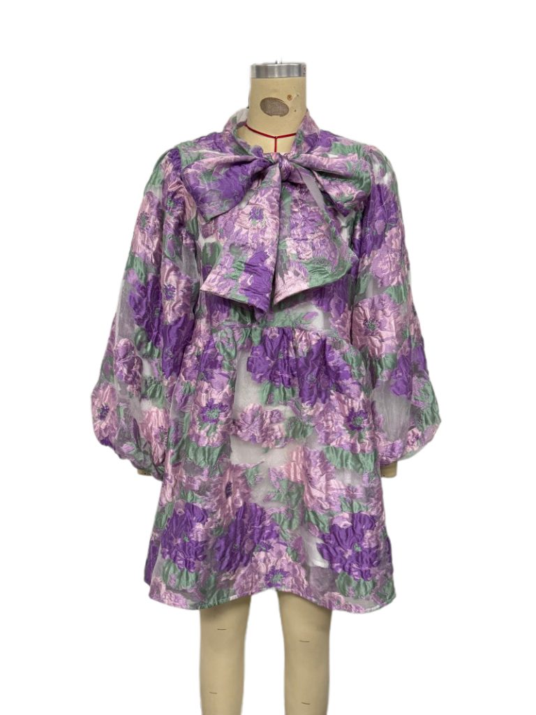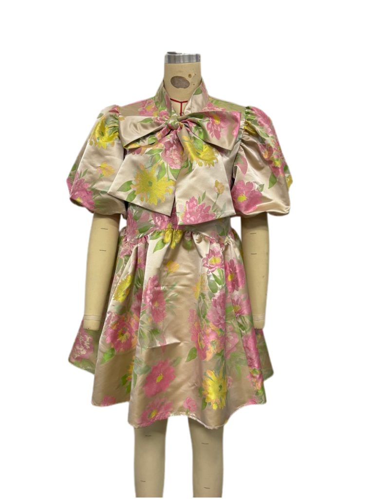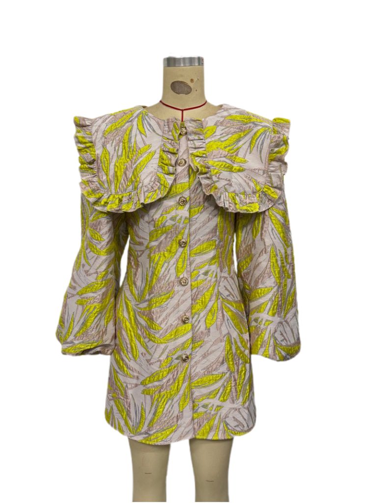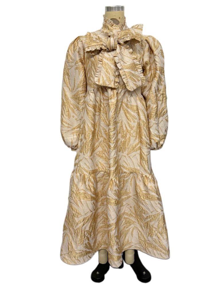 Light Pink Brocade Dress with Yellow Leaf Patterns