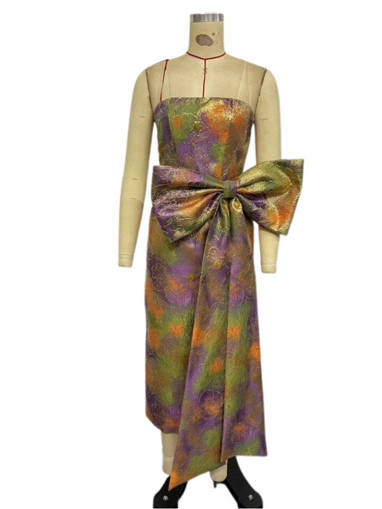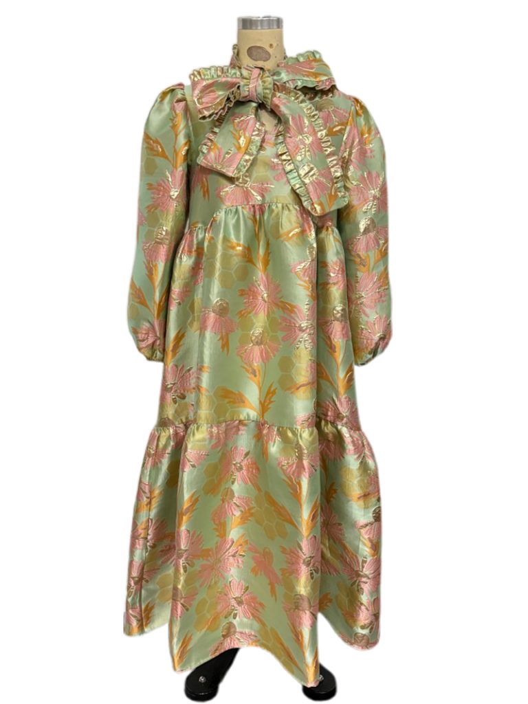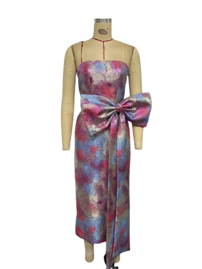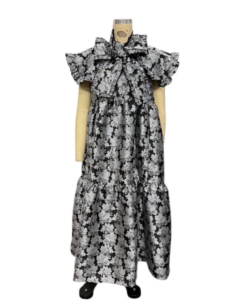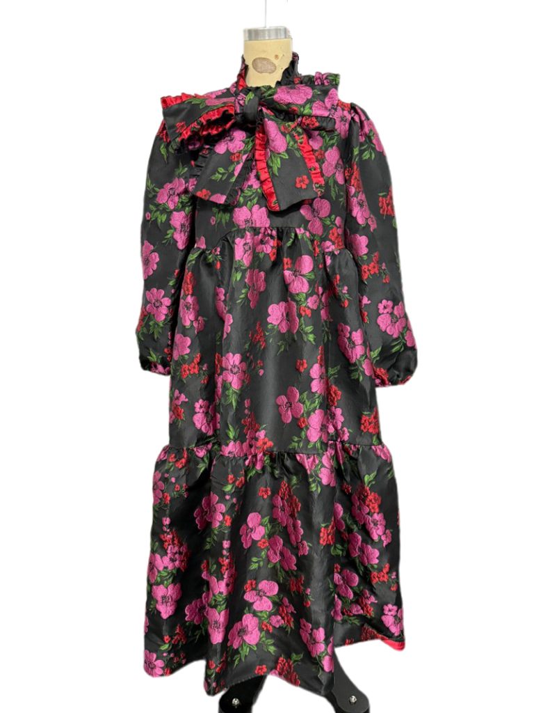 Black Brocade Maxi Dress with Pink Floral Patterns and Bow