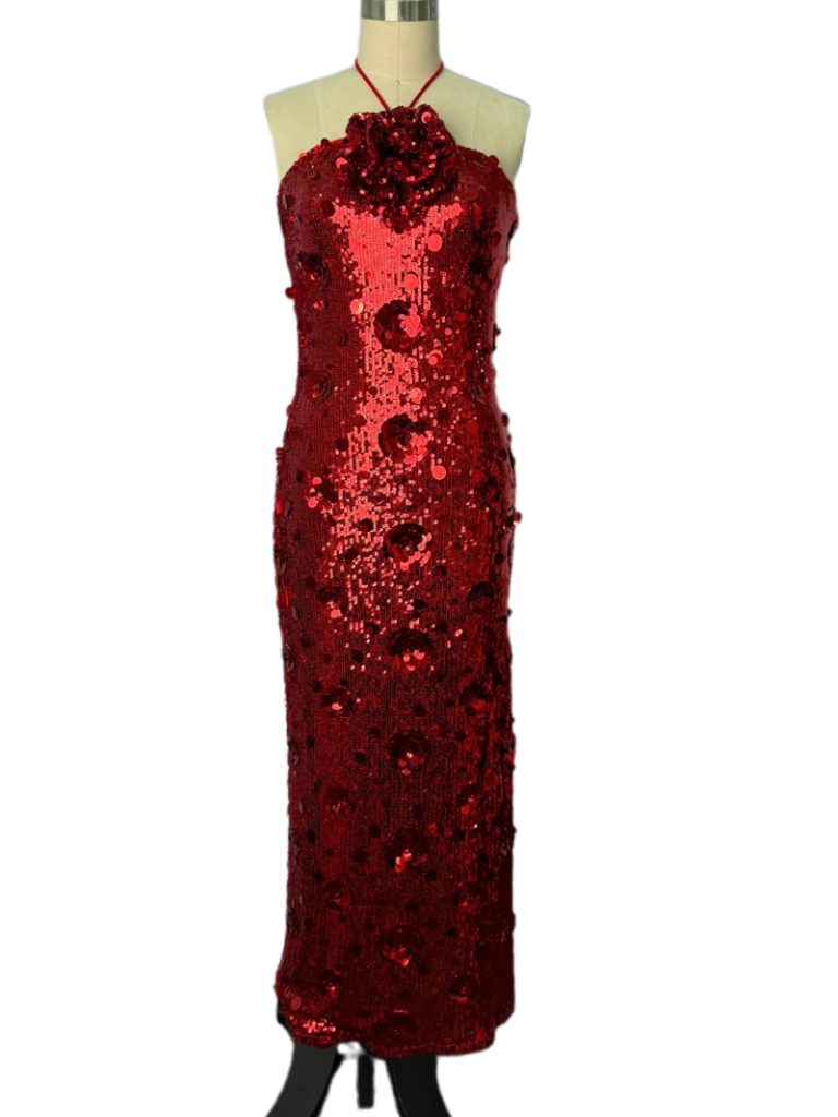 Red Sequin Halter Neck Maxi Dress with Floral Accent
