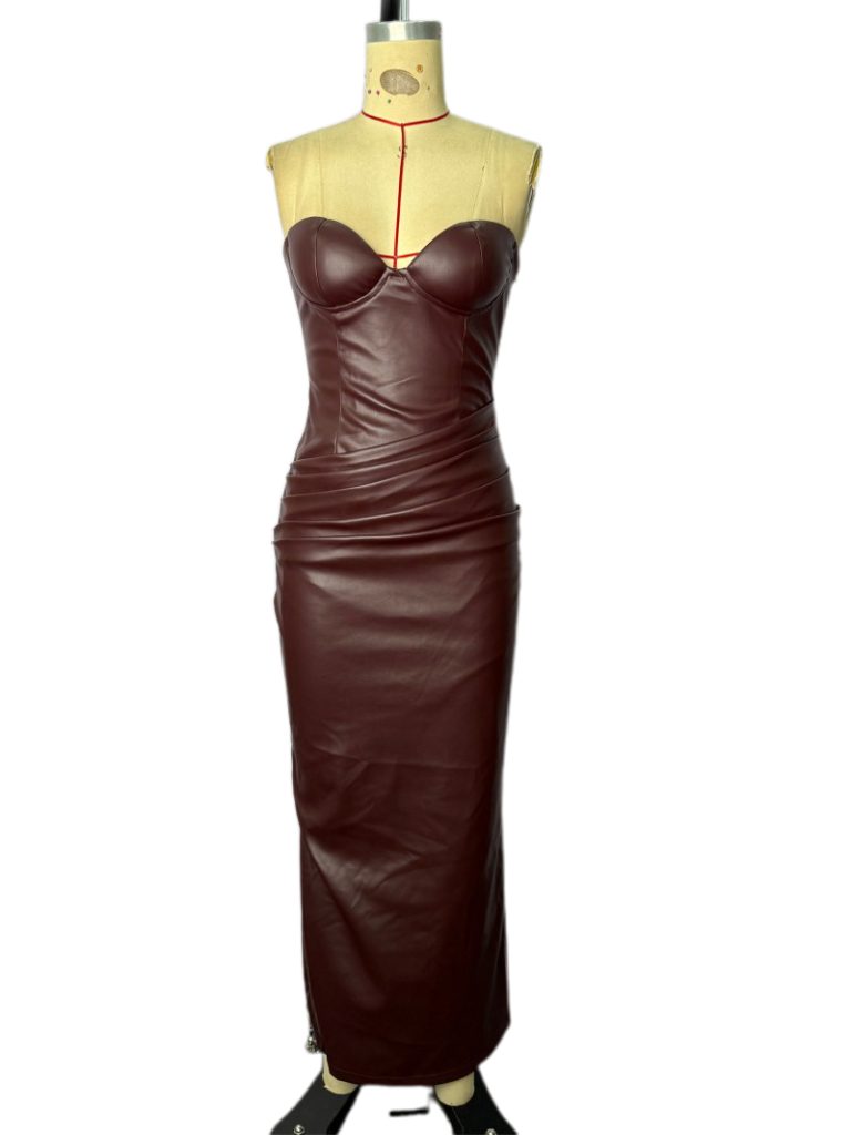 Burgundy Faux Leather Strapless Midi Dress with Corset Back