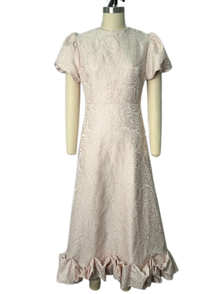 Pink Brocade Midi Dress with Puff Sleeves and Ruffled Hem