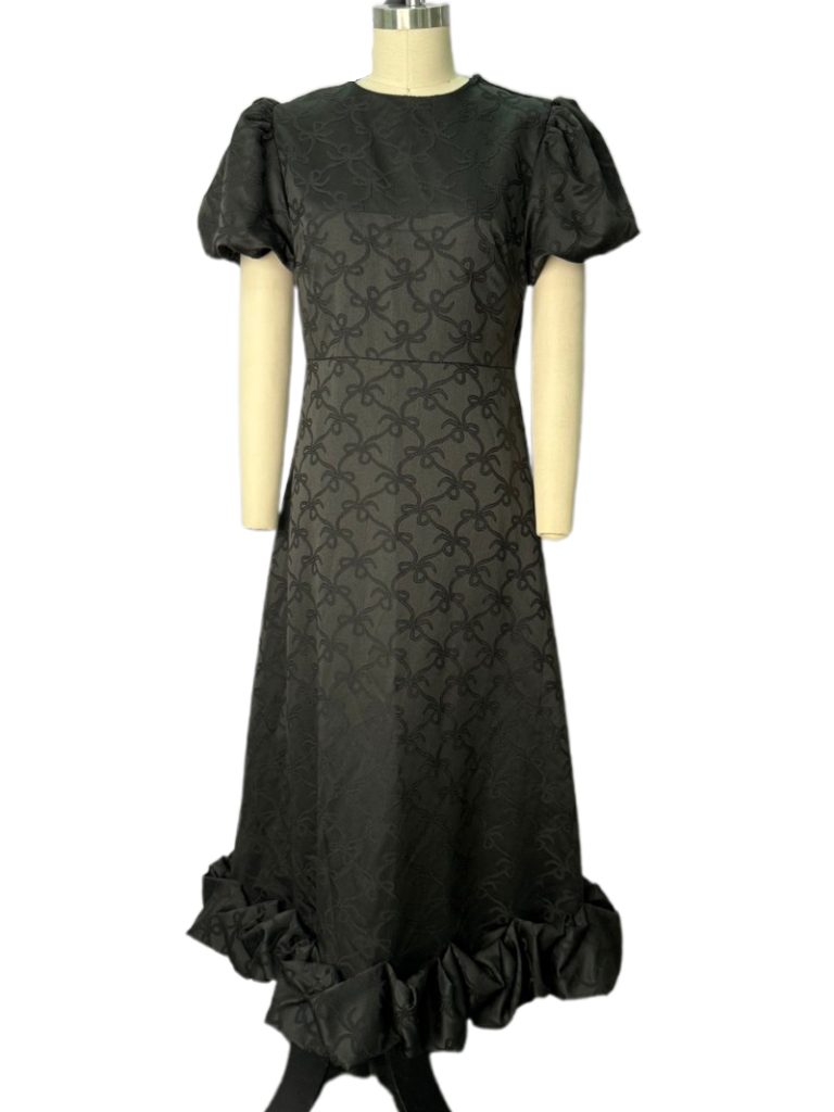Black Brocade Midi Dress with Puff Sleeves and Ruffled Hem