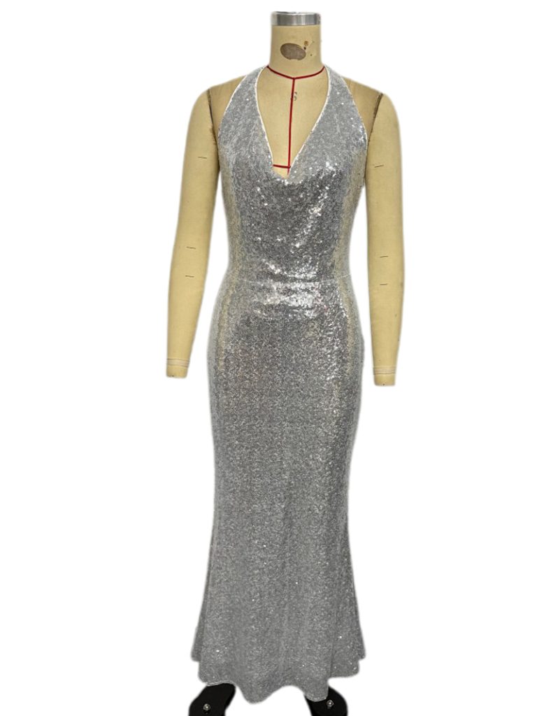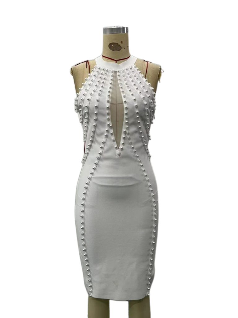 White Pearl – Embellished Halter Neck Dress with Cut – Out Details