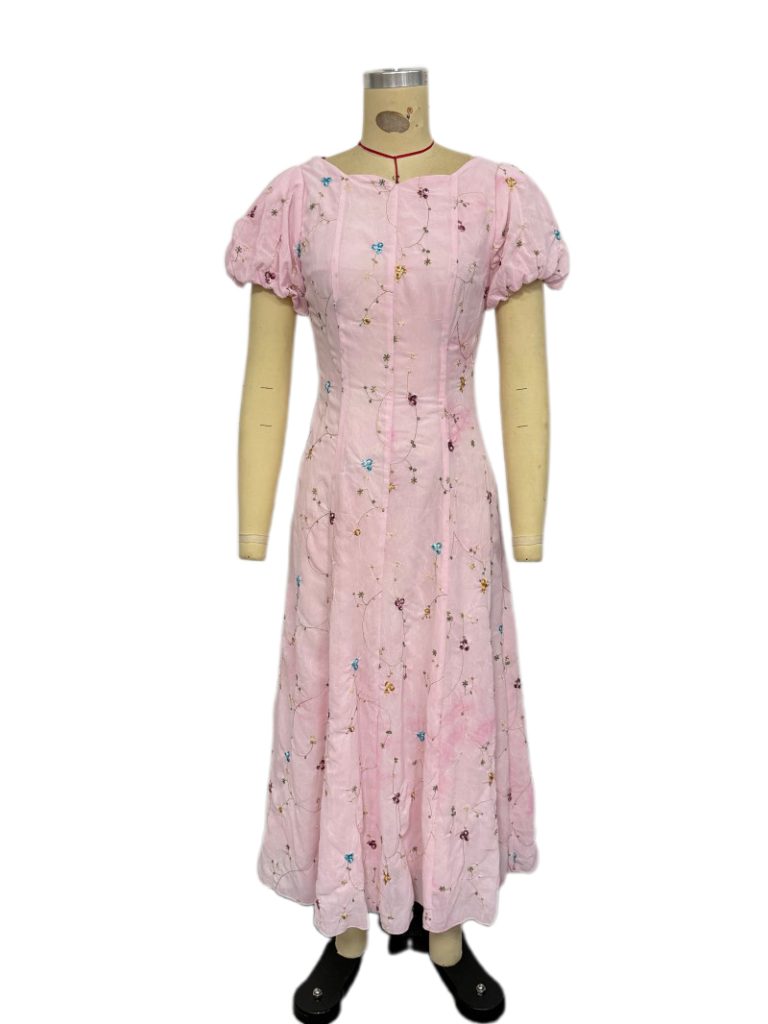 Pink Embroidered Maxi Dress with Puff Sleeves