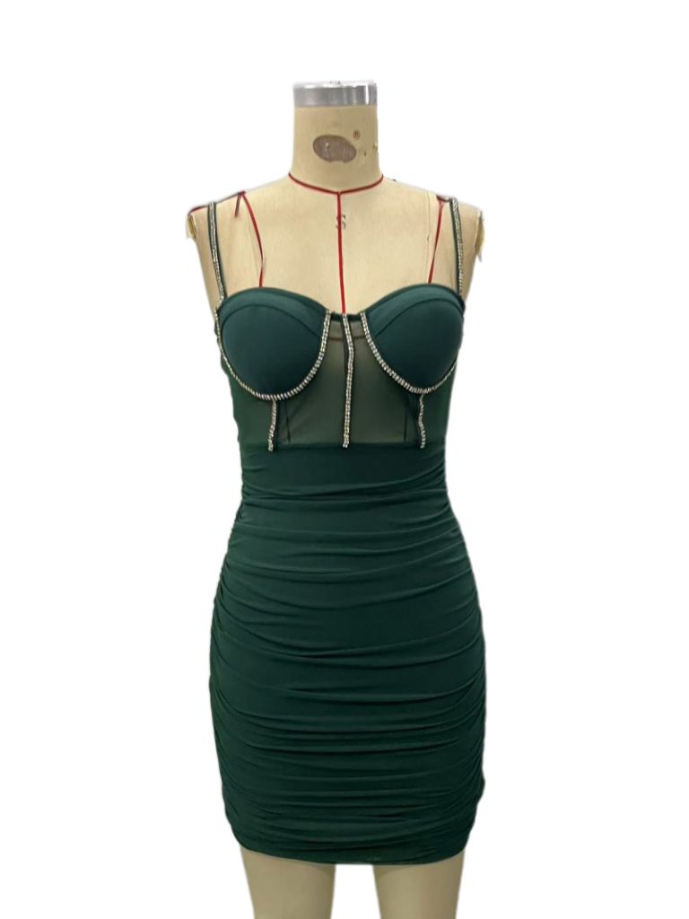 Dark Green Ruched Mini Dress with Mesh and Rhinestone Details